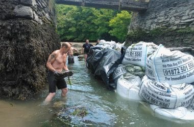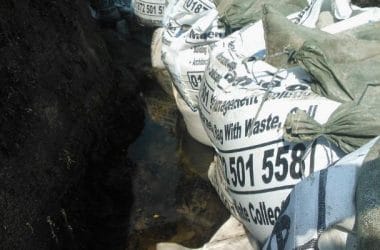 A large type French drain was installed connecting to ten flap valves releasing the water from above or on spring tide when the water comes up and over.